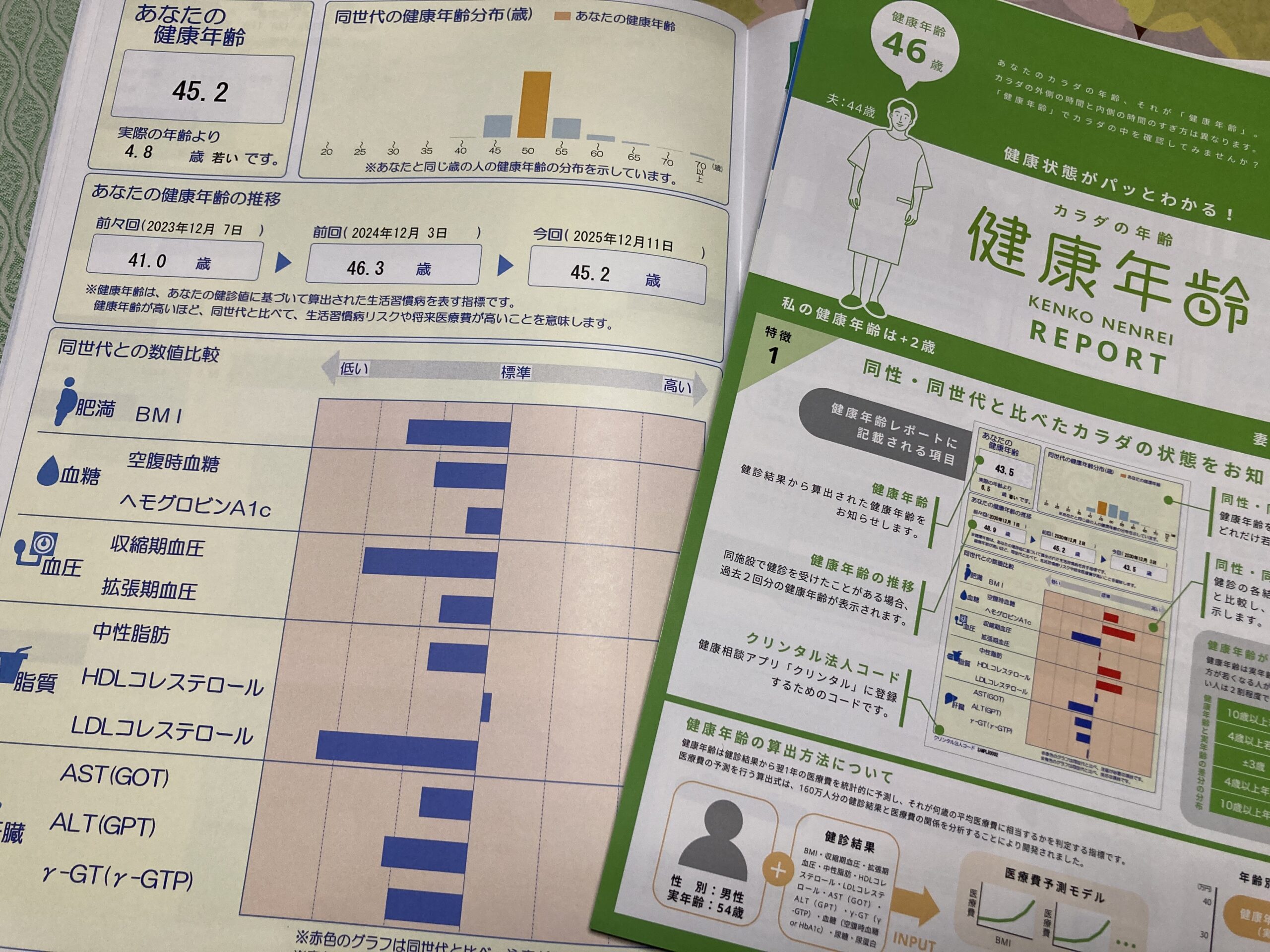 2025-12-29 Home › こぼんちゃん日記 › 健康年齢45.2歳 健康年齢45.2歳 人間ドックの結果が届きました。 健康年齢は 前回の46.3歳より45.2歳に。 一昨年の41.0歳は不思議。 現在50歳。2月で51歳。 できるだけ実年齢よりも 低い数値でいられるように心がけますが、 12ヶ月後 再検査 6ヶ月後 再検査 ばかりです。 関連記事 雪だるま こんなことに喜び ちょっと悪ふざけ 御会式桜の飾り付け 翌朝に長男が 樹木葬の石を磨く コメントを残す コメントをキャンセルメールアドレスが公開されることはありません。 ※ が付いている欄は必須項目ですコメント ※ 名前 ※ メール ※ サイト Δ