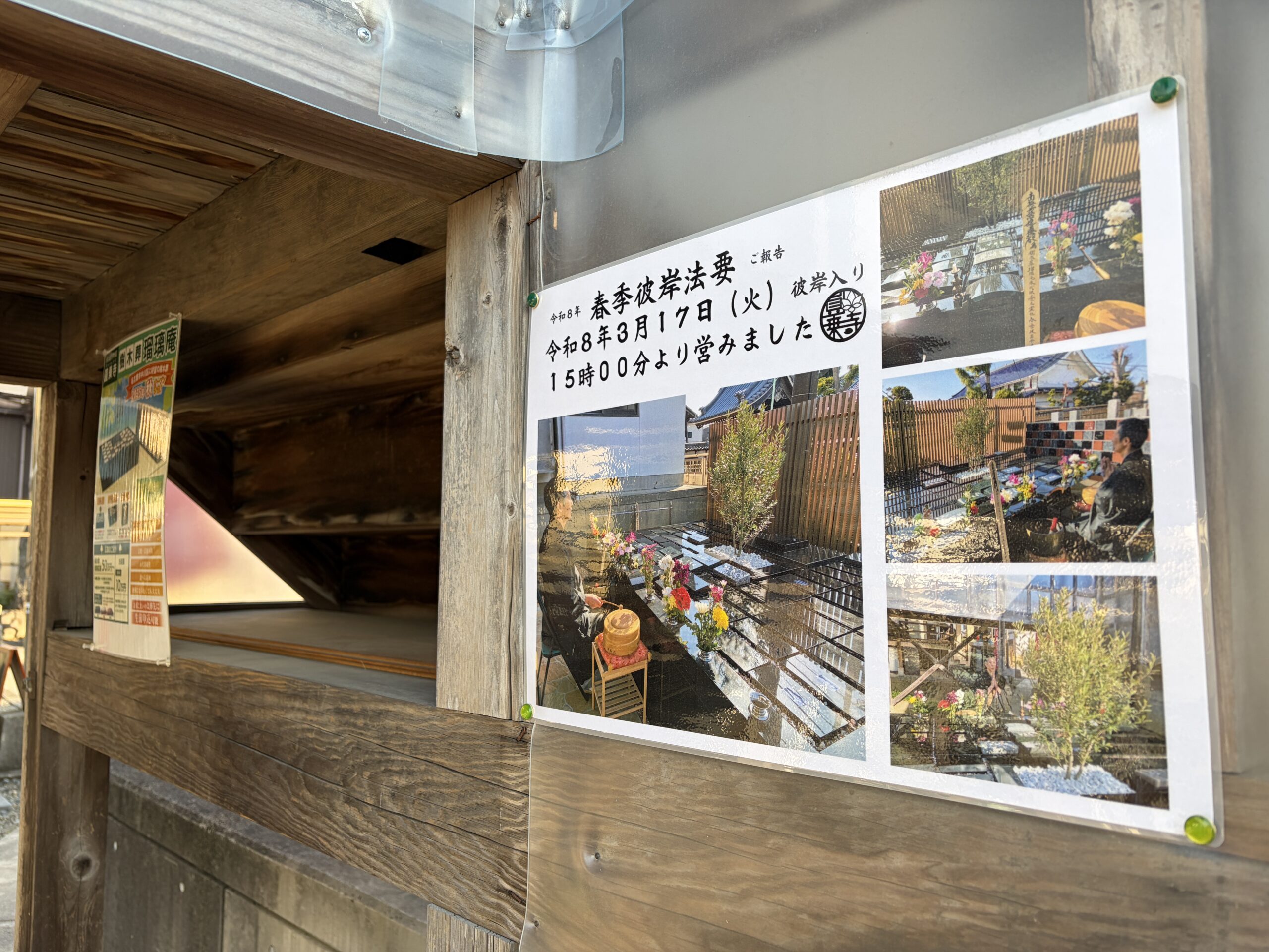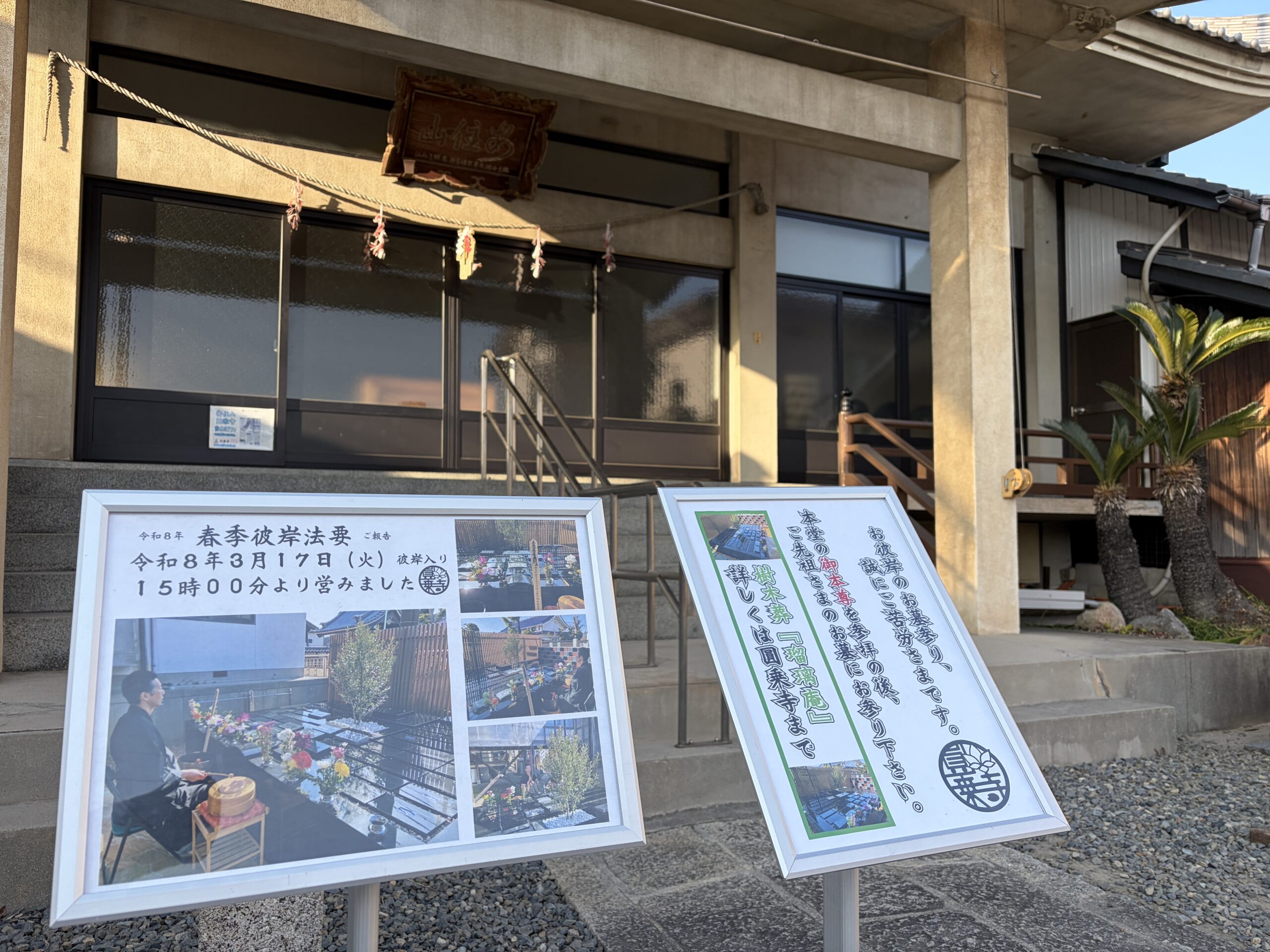 2026-03-17 Home › こぼんちゃん日記 › 彼岸法要 ご報告を掲示 彼岸法要 ご報告を掲示 圓乗寺樹木葬『瑠璃庵』 がオープンして4ヶ月半。 使用規約には 【「春彼岸」「お盆(7月)」「秋彼岸」の年3回 合祀墓の前で合同法要を執り行う】 とあります。 オープンして初の合同法要を営みました。 またこの年3回の法要は 事前案内なしで私(住職)の都合で お彼岸・お盆期間中に営むこととなっておりますのでご了承下さい。 関連記事 教区伝道企画会議 新春初祈祷会ご案内 大太鼓練習会報告 7月 御首題 身体年齢 樹木葬 清掃 コメントを残す コメントをキャンセルメールアドレスが公開されることはありません。 ※ が付いている欄は必須項目ですコメント ※ 名前 ※ メール ※ サイト Δ